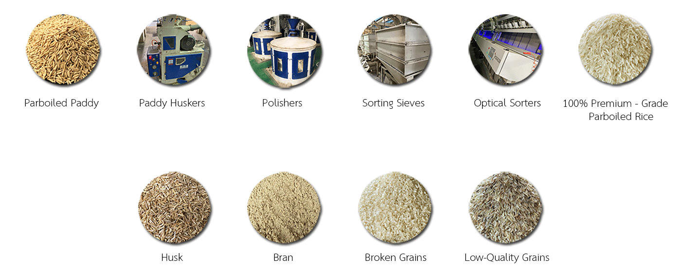 Parboiled rice is a rice product made from the paddy soaked in water until the moisturizer in the paddy reaches about 30-40%. It is then steamed until cooked; the flour in the seed is cooked and expands outwards. After that, in order for the rice to be kept for a long time and to prevent the fungus, the parboiled paddy must be dehumidified until the moisturizer drops to 12-14% with the rice dryers before going through the mills and polishers.